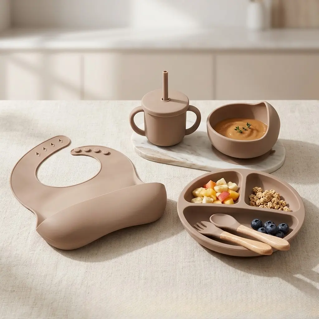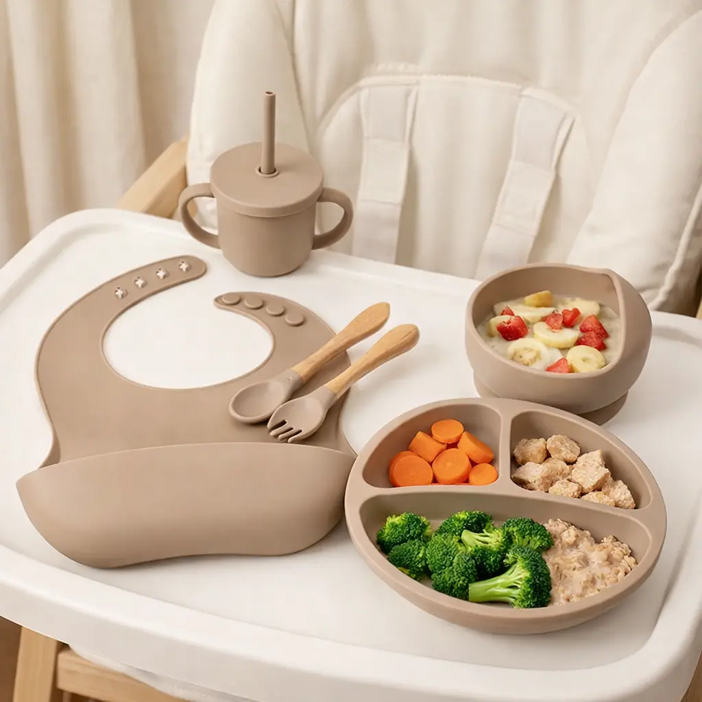 Hnedý detský silikónový jedálenský set je praktický a štýlový pomocník pre každé kŕmenie. Obsahuje kompletnú výbavu – tanierik s priehradkami, misku, podbradník, pohárik so slamkou a detský príbor, takže máš všetko potrebné pre pohodlné stolovanie na jednom mieste.